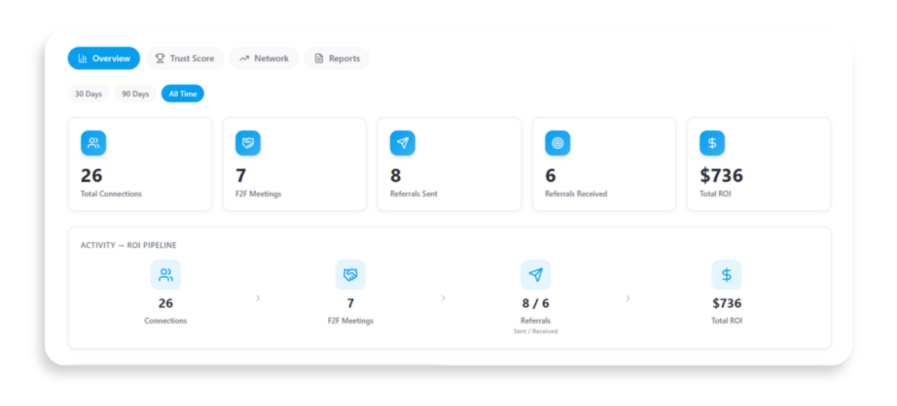 Yes! Our analytics dashboard tracks referrals given, received, conversion rates, and monetary value. You can see exactly how your network activity translates to business growth and make data-driven networking decisions.