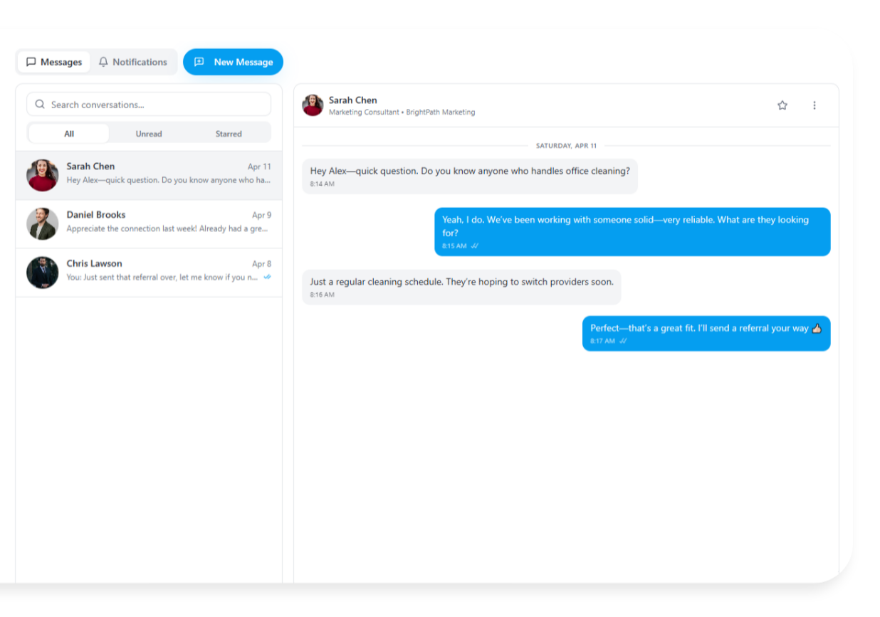Communicate securely without sharing personal contact info. Built-in chat keeps your conversations organized and professional.